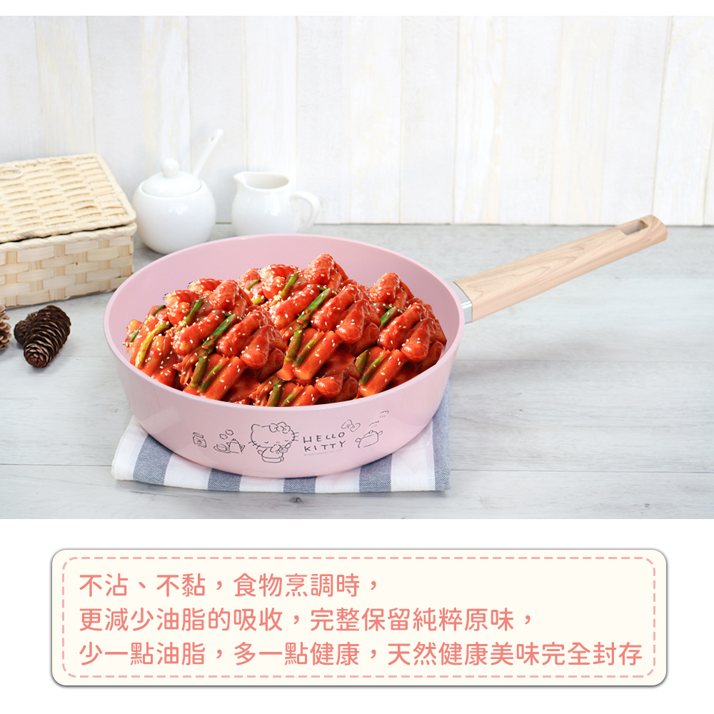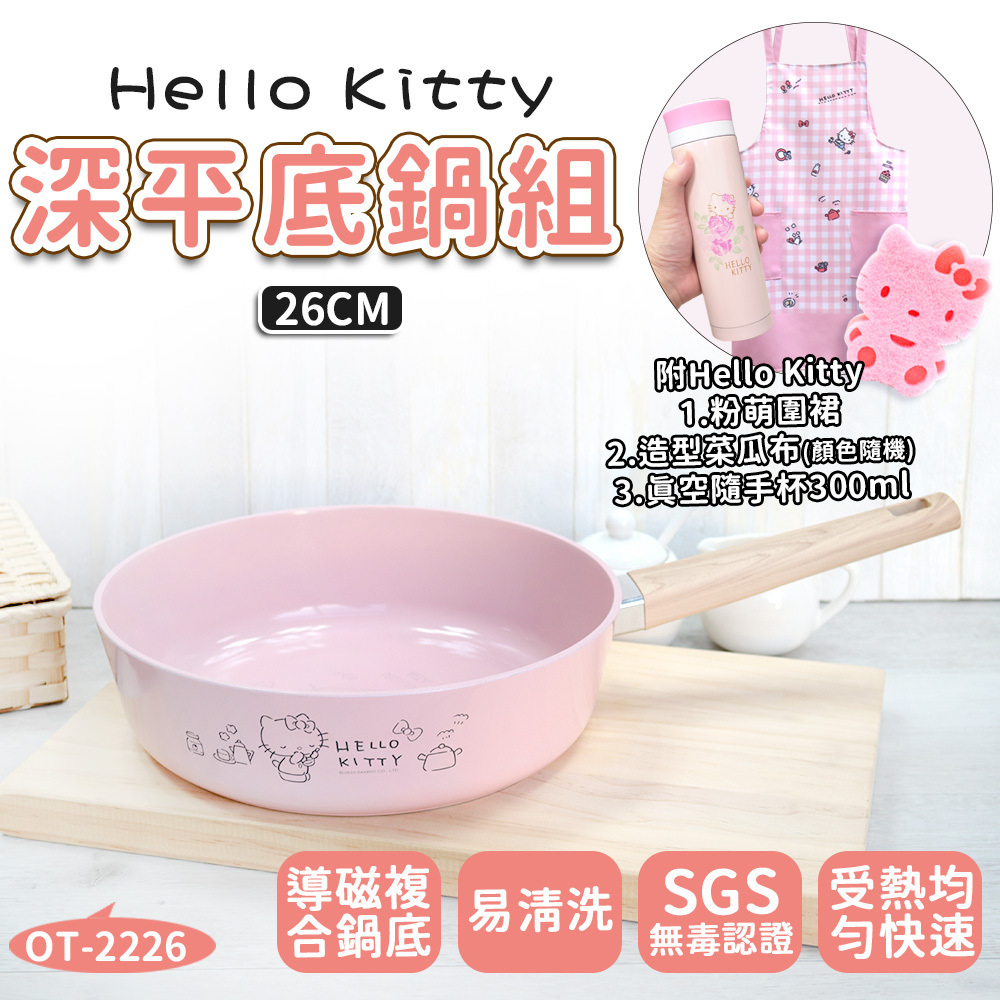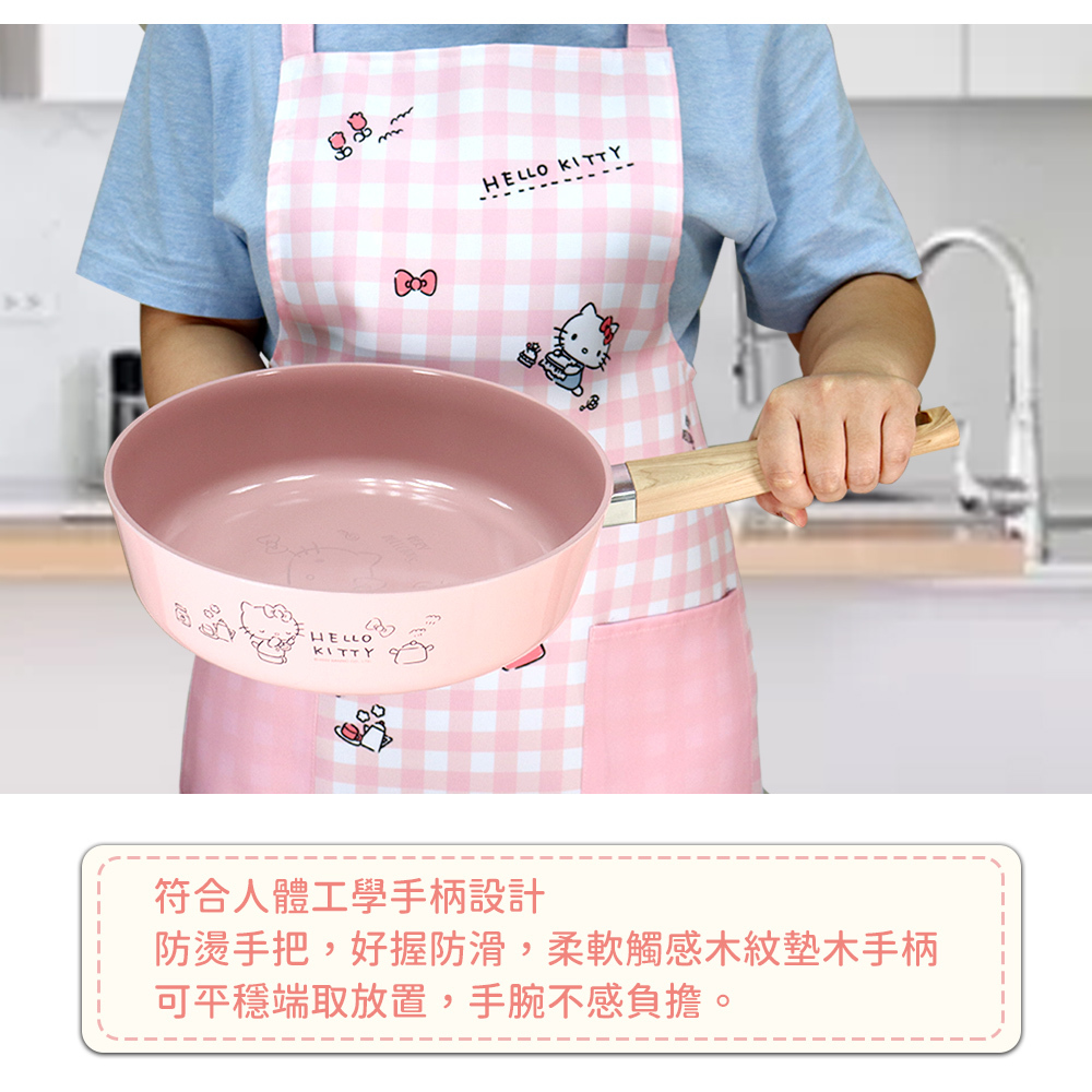 【Sanrio】Hello Kitty-陶瓷不沾26公分深平底鍋+圍裙組+隨手杯組 OT-2226AE